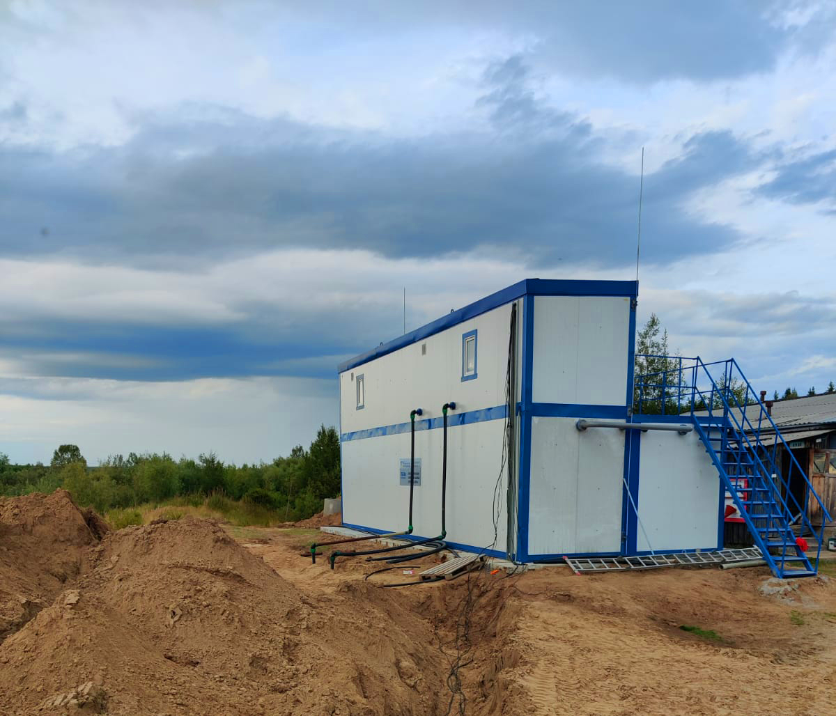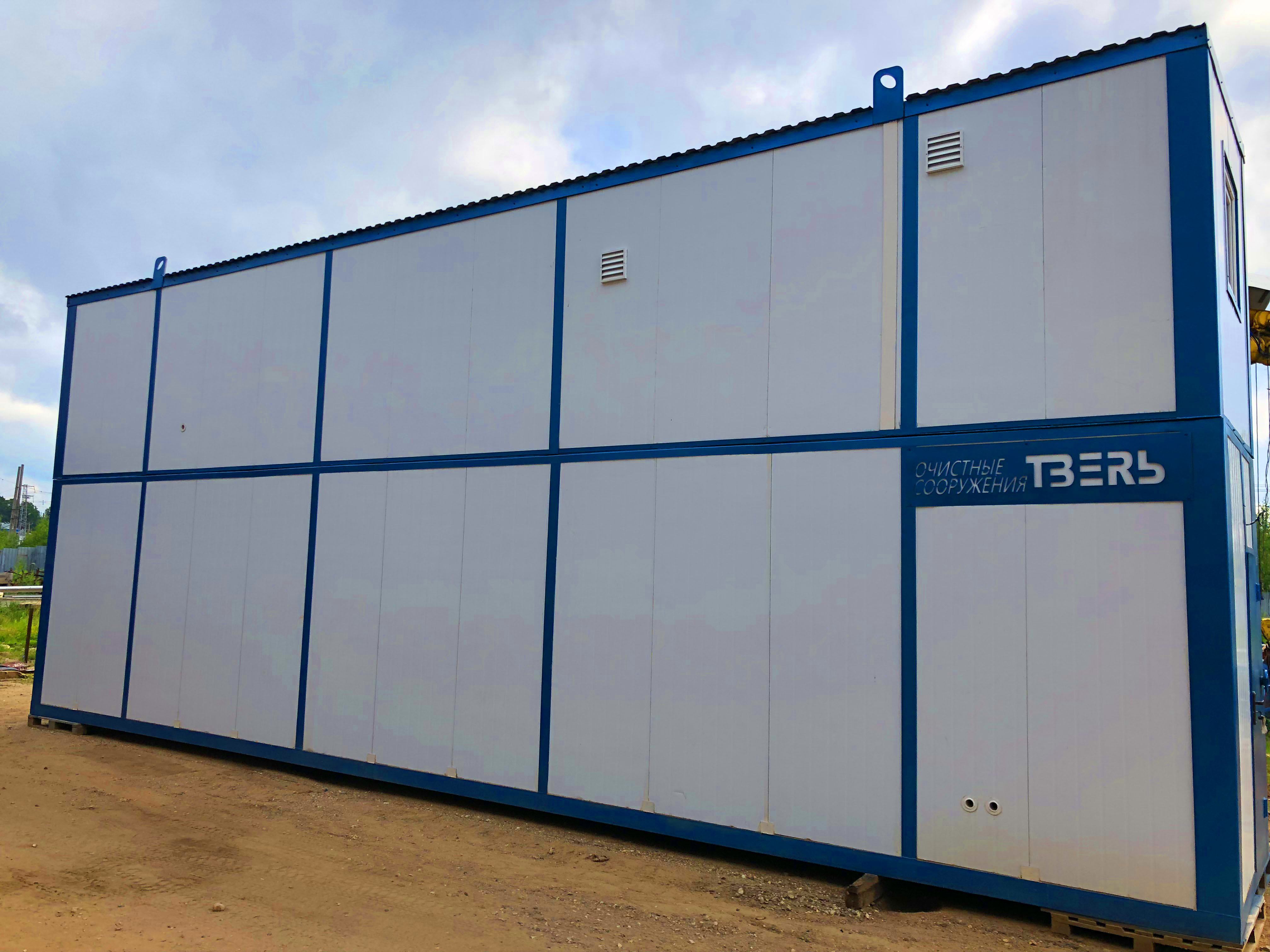 Станция очистки бытовых сточных вод "ТВЕРЬ-100С" представляет из себя утепленное здание из блок-модулей, установленных на фундаменте, со всем технологическим оборудованием внутри.